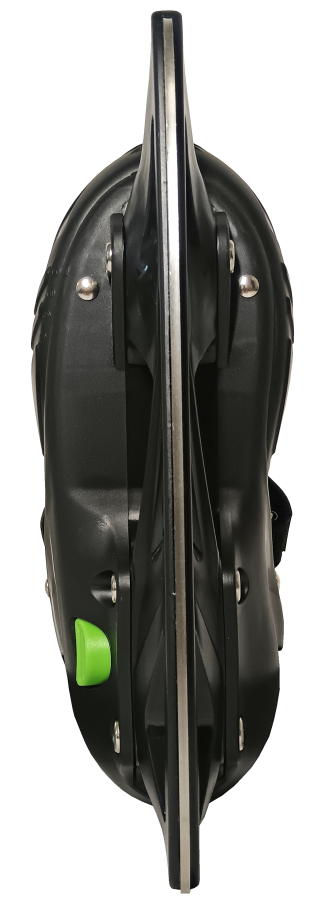 Press the colored button on the bottom of the skeleton of the shoe - above the knife holder and hold it in the pressed position. This allows the front of the boot to slide out and in as required. Move the front of the shoe skeleton forward or backward to adjust the size needed. The knob is then released. This locks the front of the shoe so that it no longer moves and stays in the selected position.