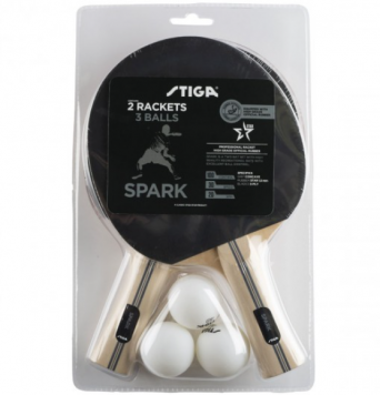 Zviedru firmas STIGA SportsAB galda tenisa rakešu komplekts SPARK raketes 2 gab. un 3 bumbiņas. Augstas kvalitātes hobija rakete ar lielisku bumbas kontroli, augstas kvalitātes ITTF apstiprināta oficiāla gumija. ROKTURIS: CONCAVE; GUMIJA: 1,5 mm; LĀPSTIŅA: 5-PLY. ĀTRUMS: 30; GRIEŠANA: 20; KONTROLE: 100