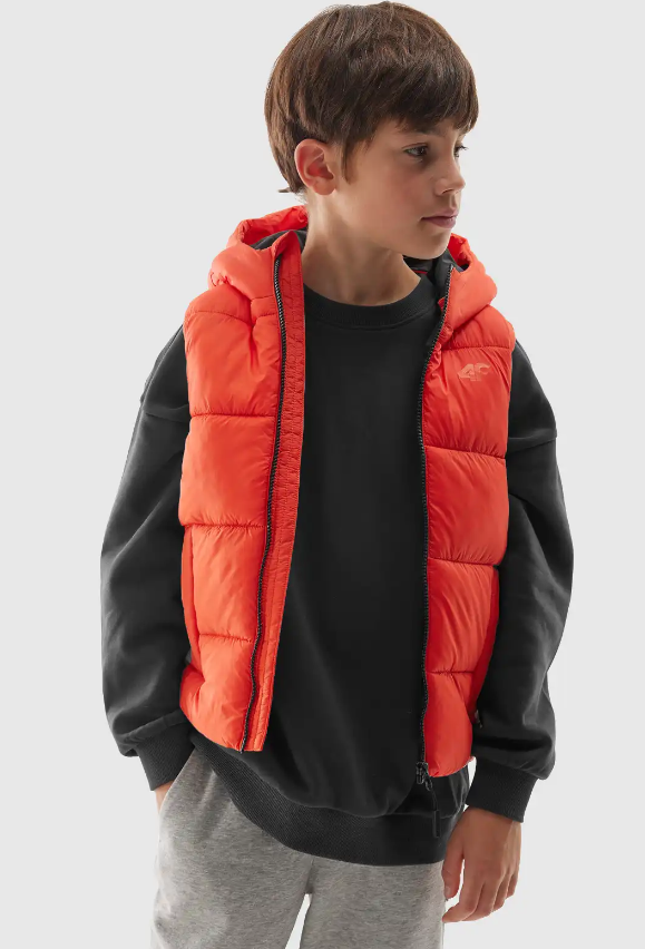 Zēnu īss dūnu bezrocis ir aprīkots ar integrētu kapuci bez regulēšanas. Sānos ir 2 atvērtas kabatas.