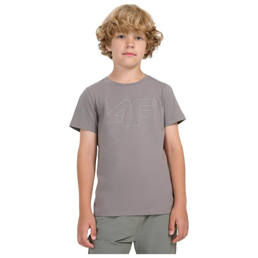 Zēnu 4F t-krekls ir izgatavots 100% no kokvilnas, tāpēc ir mīksts, izturīgs un pieskārienā patīkams. Apaļa dekoltē ir pabeigta ar vieglu rib tipa apdari. Priekšpusē redzama apdruka "4F". Nolaistas piedurknes piešķir brīvību.