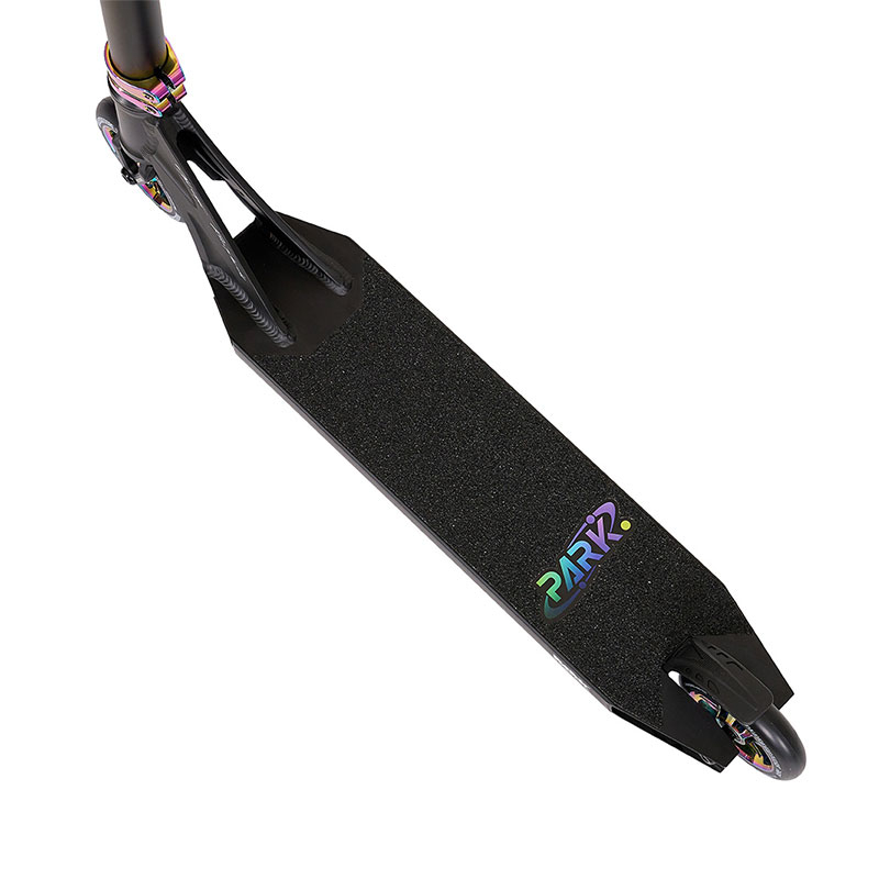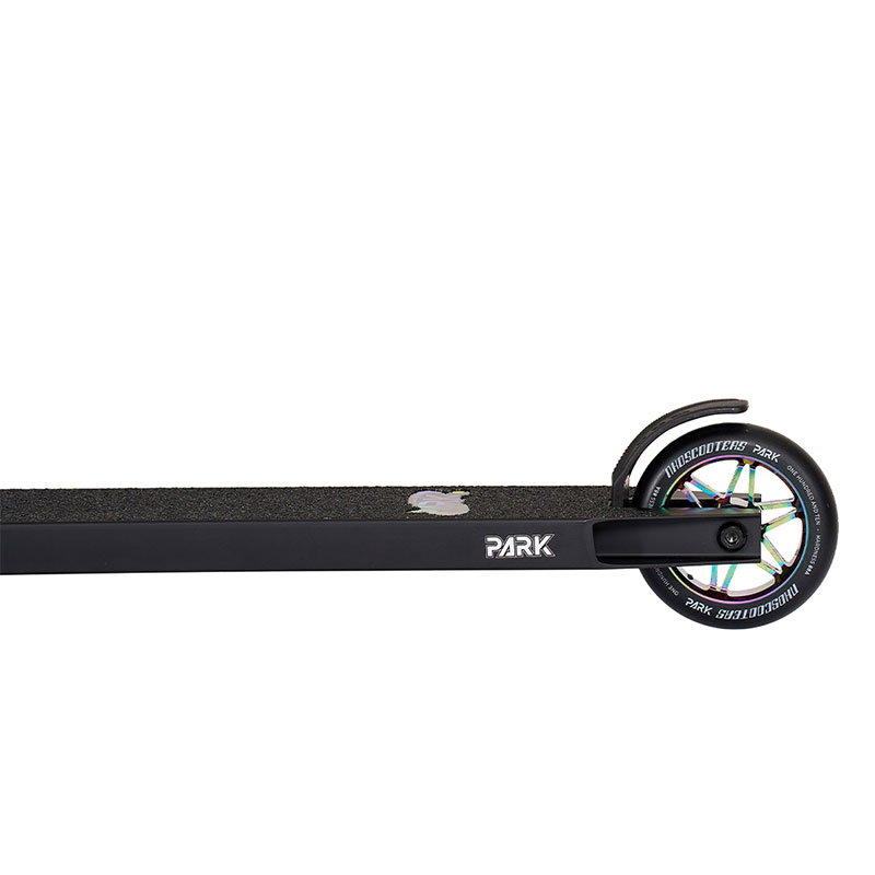 Izturīgi 110mm lieli riteņi. NKD Park modelis aprīkots ar mīkstiem 110mm riteņiem, kas ir skrejriteņu zelta izmēra standarts. Izplatītākais riteņu izmērs, kuram tiek piedāvāta lielākā izvēle krāsu un dažādo disku dizainu opcijas. Šī modeļa riteņiem ir mīksts poliuretāna (tautas valodā sauktais kaučuks) ārējais slānis un izturīgs alumīnija disks. Šāda veida alumīnija diska konstrukcija nodrošina riepiņām nepieciešamo izturību, kad tiek izpildīti dažādi triki un lēcieni.