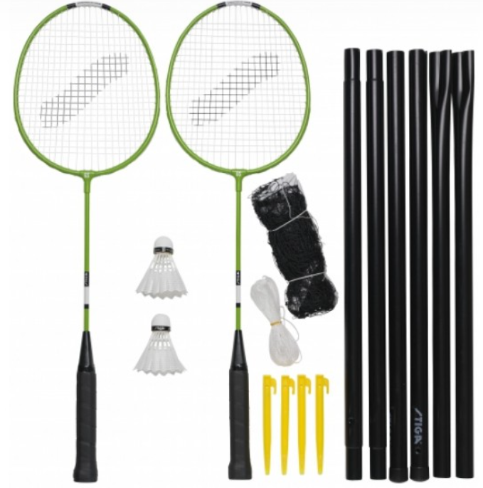 Zviedru firmas STIGA Sports AB badmintona komplekts GARDEN SET. Lieliski piemērots spēlei ārā. Komplektā ietilpst: 2 Hobby SR raketes, 2 volāni, tīkliņš ar stabiņiem, badmintona rakešu un aksesuāru čehols.